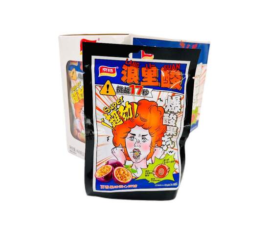 Карамель в кислой обсыпке, в самом центре конфеты идет шипучка. Попробуйте яркий вкус этой карамели со вкусом маракуйи