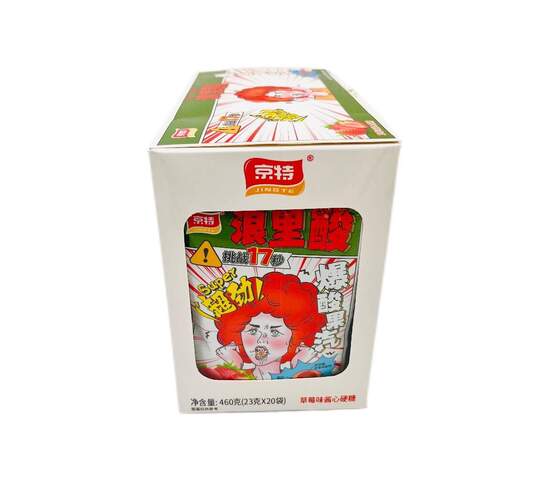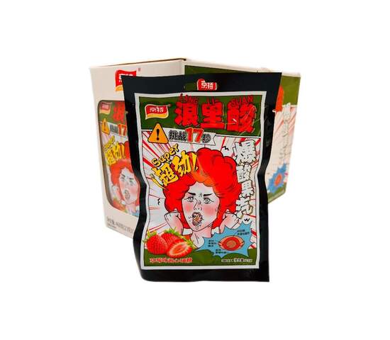Карамель в кислой обсыпке, в самом центре конфеты идет шипучка. Попробуйте яркий вкус этой карамели со вкусом клубники