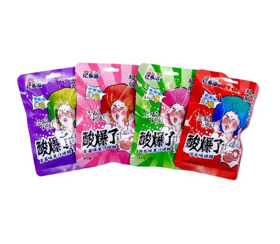 Карамель в кислой обсыпке, в самом центре конфеты идет шипучка. Попробуйте яркий вкус этой карамели ( персик, черника , арбуз, кола)