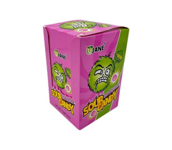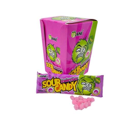 Камушки в кислой обсыпке. Кислый вкус быстро переходит в приятный клубничный.