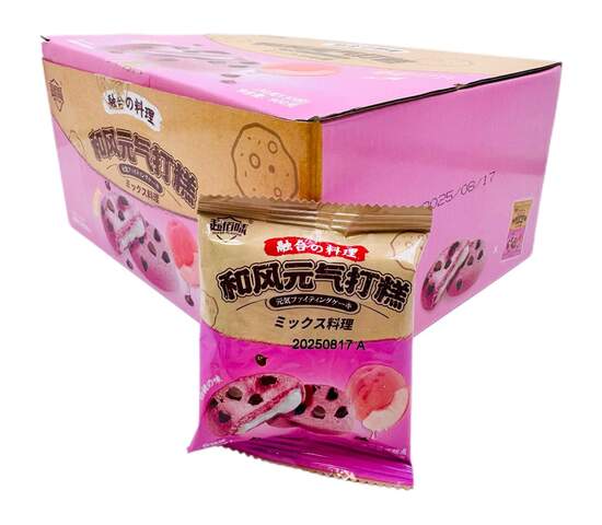 Состав: рисовый пирог "Сюэмэйнян" (мальтозный сироп, трегалоза, вода, кокосово-молочный ароматизированный сироп, рисовая мука, растительное пальмовое масло, кондитерский жир) (39%), специальная пшеничная мука (пшеница, кукурузный крахмал, глютен, витамин C, стеароиллактилат кальция), сливочное масло (5%), шоколадные капли на основе заменителя какао-масла (5%), сахар, свежие яйца, пищевые добавки (гидроксипропилдикрахмалфосфат, глицерин (E422), сорбит (E420), моно- и диглицериды жирных кислот (E471), полиглицерин-эфиры жирных кислот (E475), эфиры сахарозы и жирных кислот (E473), сорбиновая кислота (E200), глюконо-дельта-лактон (E575), комплексный краситель (свекольный красный, E162), каррагинан (E407), ксантан (E415), полиакрилат натрия (E466)), глюкозно-фруктозный сироп, сухое цельное молоко, соль, ароматизаторы "Персик".