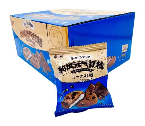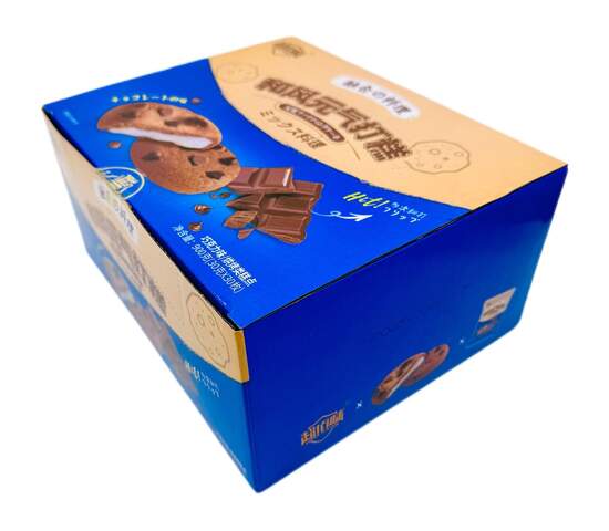 Состав: рисовый пирог "Сюэмэйнян" (мальтозный сироп, трегалоза, вода, кокосово-молочный ароматизированный сироп, рисовая мука, растительное пальмовое масло, кондитерский жир) (39%), специальная пшеничная мука (пшеница, кукурузный крахмал, глютен, витамин C, стеароиллактилат кальция), сливочное масло (5%), шоколадные капли на основе заменителя какао-масла (5%), сахар, свежие яйца, пищевые добавки (гидроксипропилдикрахмалфосфат, глицерин (E422), сорбит (E420), моно- и диглицериды жирных кислот (E471), полиглицерин-эфиры жирных кислот (E475), эфиры сахарозы и жирных кислот (E473), сорбиновая кислота (E200), глюконо-дельта-лактон (E575), комплексный краситель (свекольный красный, E162), каррагинан (E407), ксантан (E415), полиакрилат натрия (E466)), глюкозно-фруктозный сироп, сухое цельное молоко, соль, ароматизаторы "Шоколадный".