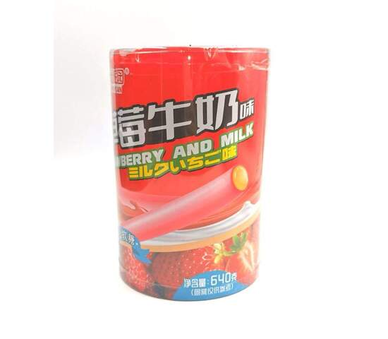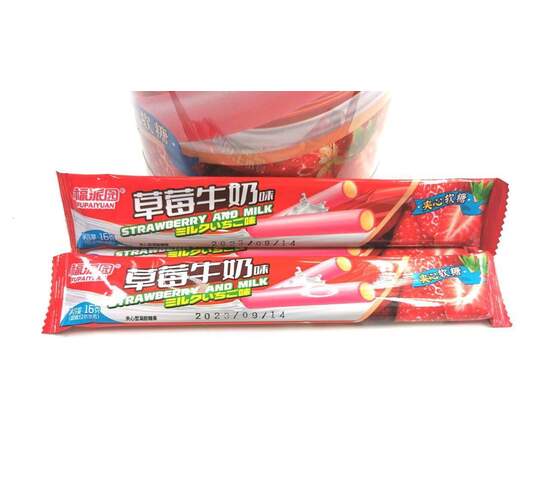 Жевательный мармелад в виде трубочек, внутри с начинкой со вкусом клубники.