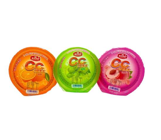 Состав: питьевая вода, белый сахар, конжаковая мука, фруктозный сироп, кокосовое волокно, каррагинан, хлорид калия, лимонная кислота, цитрат натрия, сорбат калия, цикламат, ацесульфам калия, сукралоза, тартразин