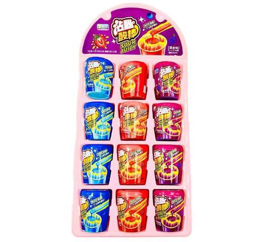 Состав: мальтозный сироп, сахар, кукурузный крахмал, каррагинан, лимонная кислота, цитрат натрия, DL-яблочная кислота, DL-винная кислота, красители (красный очаровательный AC, синий блестящий FCF), ароматизатор (виноград, черника, клубника).