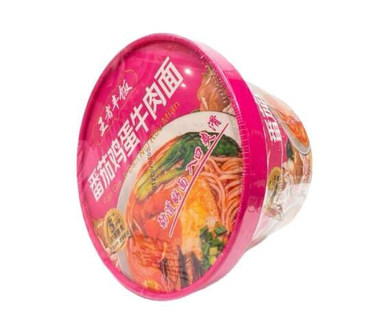 Состав: Лапша: мука пшеничная, масло пальмовое рафинированное, крахмал, соль, комплексная пищевая добавка (стабилизаторы, эмульгаторы), краситель (рибофлавин). Соус: томатная паста, масло растительное, бульон из куриных костей, говядина, приправа со вкусом говядины, овощи (чеснок, лук зеленый, имбирь), специи, соевый соус, сок из ягод годжи. Приправа и сушеные овощи: томаты обезвоженные, яйца обезвоженные, сахар, соль, кукуруза сушеная, соевый белок.